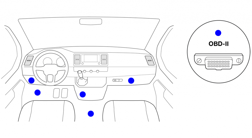 1.Localiza el puerto OBD-II .El puerto OBD-II suele estar localizado debajo del panel de instrumentos, debajo del volante. Si no está localizado debajo del volante, comprueba si está localizado en alguna de las áreas indicadas en la imagen.